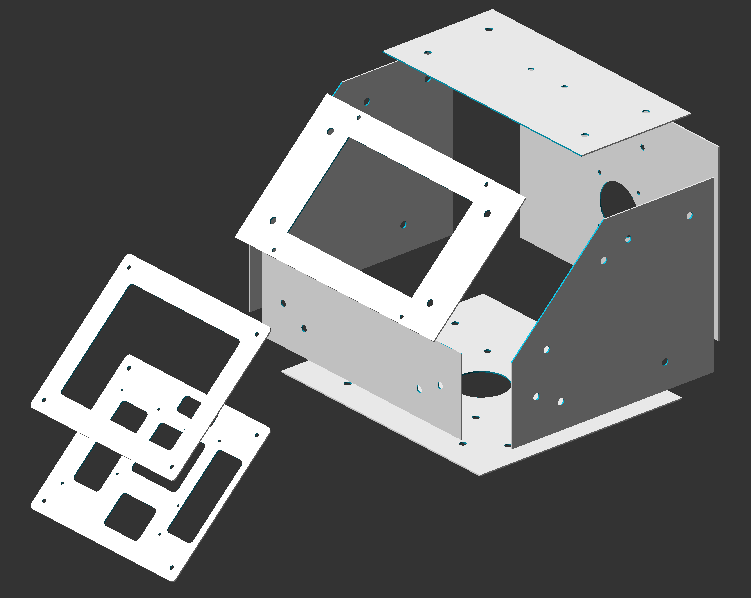 Back Plate and Top Plate are attached to each other.Back Plate is affixed to the Bottom Plate by a hinge.Bottom Plate, Left Plate, Right Plate, Front Bottom Plate and Frton Angle Plate are all attached